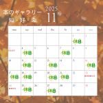 2025年11月8日 / 最終更新日時 : 2025年11月8日 admin 「本と花」本のギャラリー知・好・楽 2025年 11月営業カレンダーです。 11月は、出張が増えてお休みが多くなってしまいました。 ご不便をおかけしますが、よろしくお願い申し上げます。