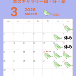 2026年3月2日 / 最終更新日時 : 2026年3月10日 admin 「本と花」本のギャラリー知・好・楽 3月の営業カレンダーです。 3月の営業カレンダーです。8日、15日日曜日は、お休みします。 週末、祝日の12時~17時営業しています。ご予約いただければ、閉店時間を延長も可能です。 どうぞ、よろしくお願いします。